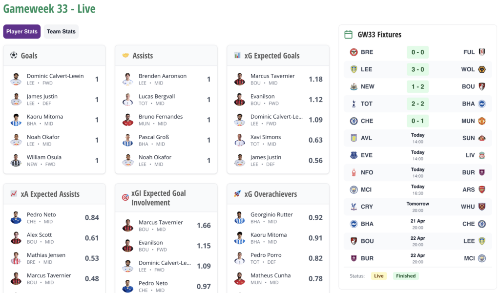 Here you can follow the scores, watch the defensive contribution (DefCon) points roll in, see who the leading players are for xG and more as the games play out, as seen below:
